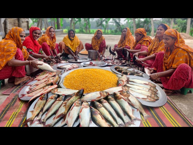 12 village women processing, cutting & cooking carp fish curry with pulse Daal to feed 450+ people of village.